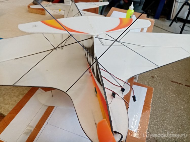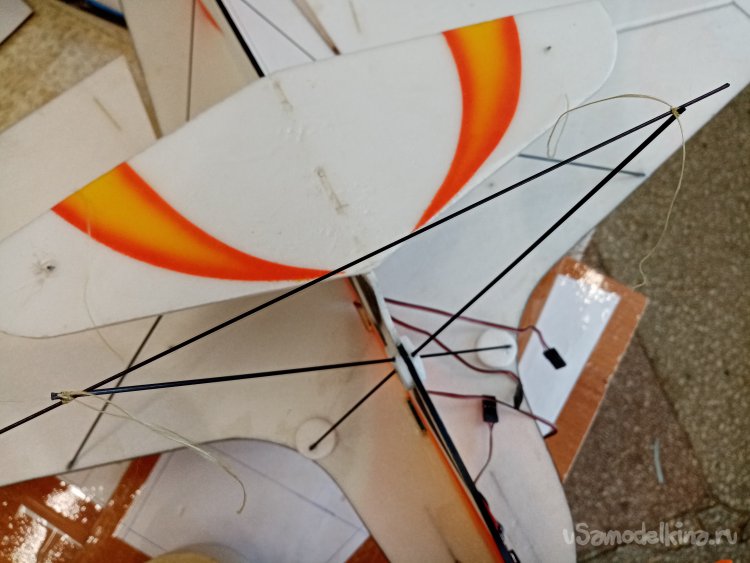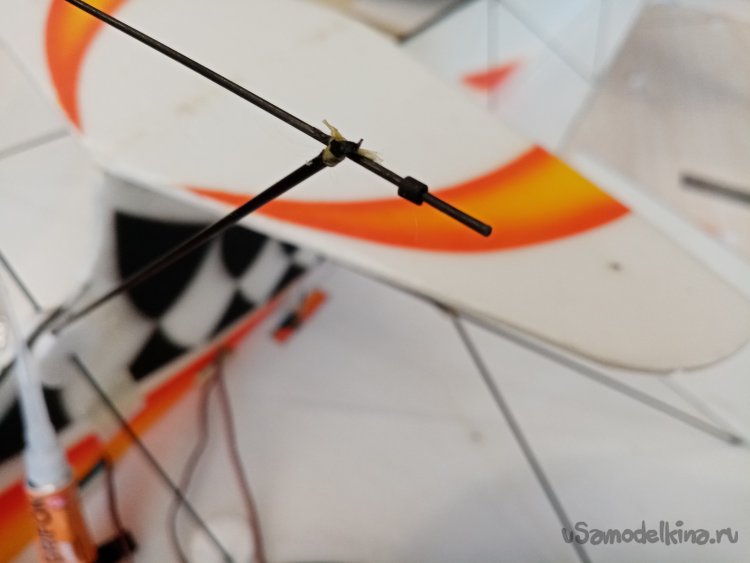 Приклеиваю поперечную ось на стойки капелькой циакрина. Затем осторожно привязываю детальки арамидной ниткой и опять капаю циакрина на соединение. Все застыло и приклеилось. Отрезаю ненужные кончики.