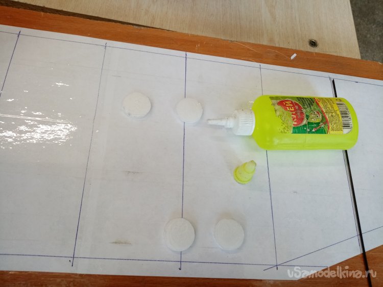 Затем на места проколов нужно приклеить кружки усиления. Наношу клей титан на кружки и на места приклейки на фюзеляже. Для удобства пользования разлил из большой бутылки в маленькие флакончики из под канцелярского клея ПВА. У них тонкие носики, удобно работать. После нанесения клея, выдерживаю некоторое время, для подсыхания.