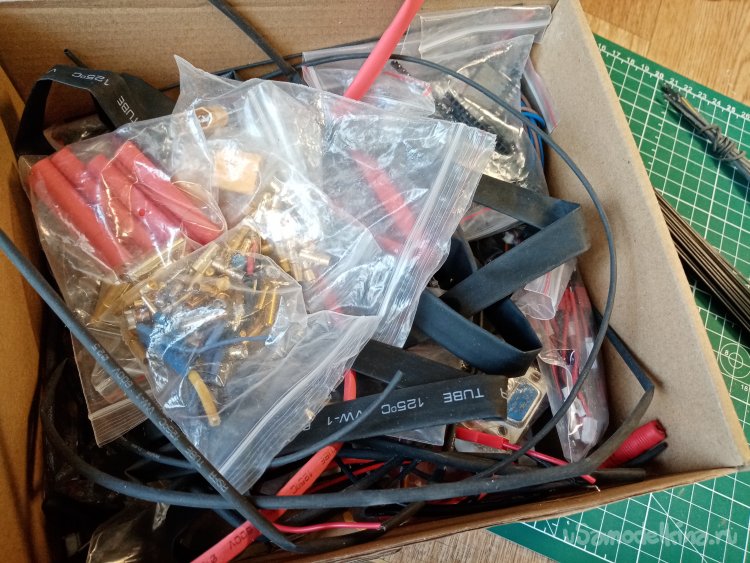 Затем нужно подобрать толщину термоусадки для фиксации колесиков на оси. Открываю коробку с термоусадкой и контактами. Подбираю нужный диаметр. Примериваю на оси. Все в порядке. Попал.
