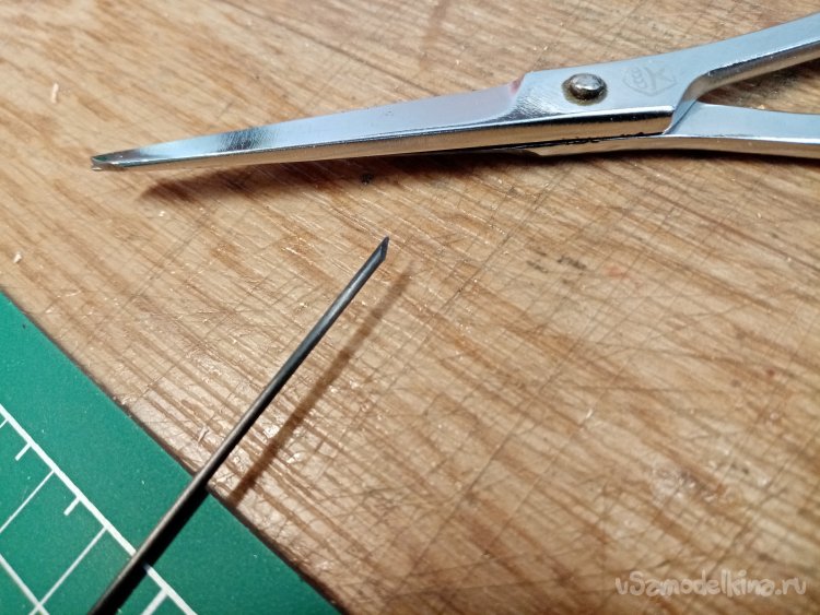 Прутик разрезаю обыкновенными ножницами. Один кончик срезаю наискосок. Поскольку не буду сверлить отверстия в пенопласте, это перебор.