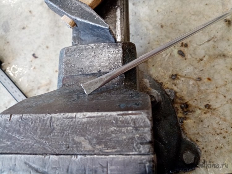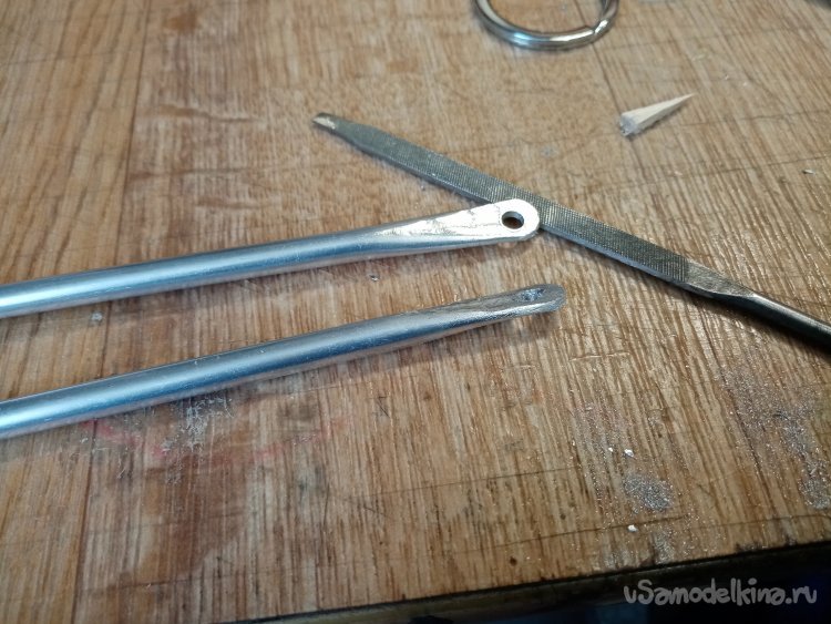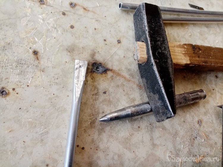 Другие кончики трубок просто расплющиваю молотком. Керню в нужном месте и сверлю отверстия для колечек.