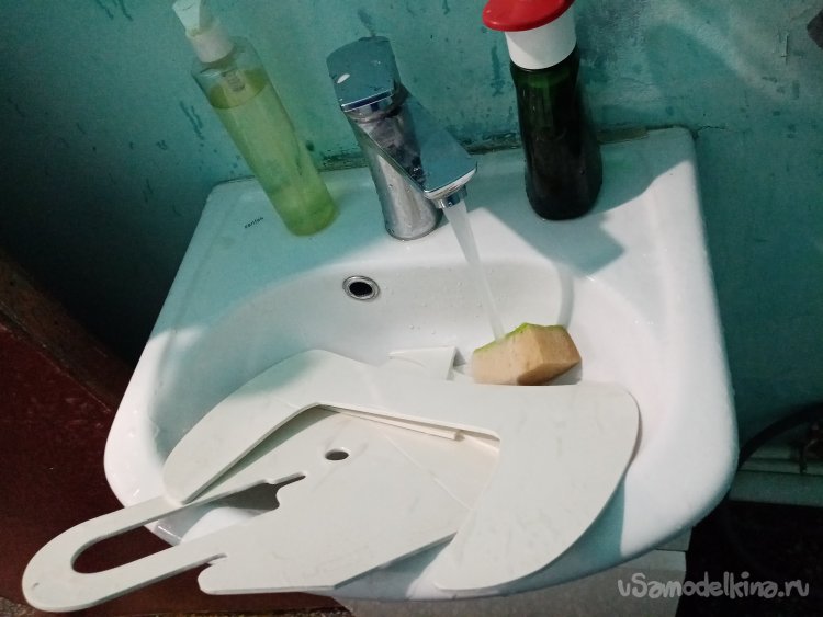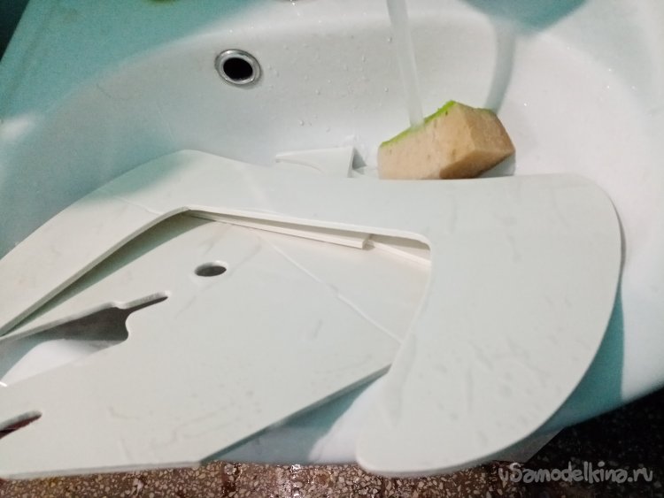 После зачистки и шкурения деталей отмываю пластик в теплой воде с применением хозяйственного мыла. Смывается не только грязь, но и стружки пластика. Которые имеют неприятную особенность, прилипать в разные места, даже слегка наэлектризовавшись. Поле купания протираю все тряпочкой.
