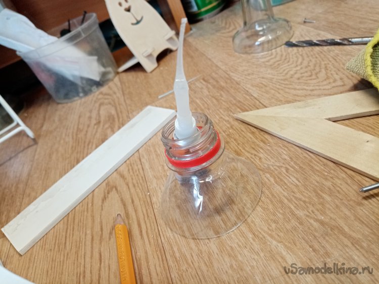 Склеивать пластик буду при помощи циакрина. Качество склейки пластика довольно высокое. Чтобы тюбик не валялся по столу и случайно ничего не приклеил. Быстренько изготовил простую подставку из горлышка от пластиковой бутылки.