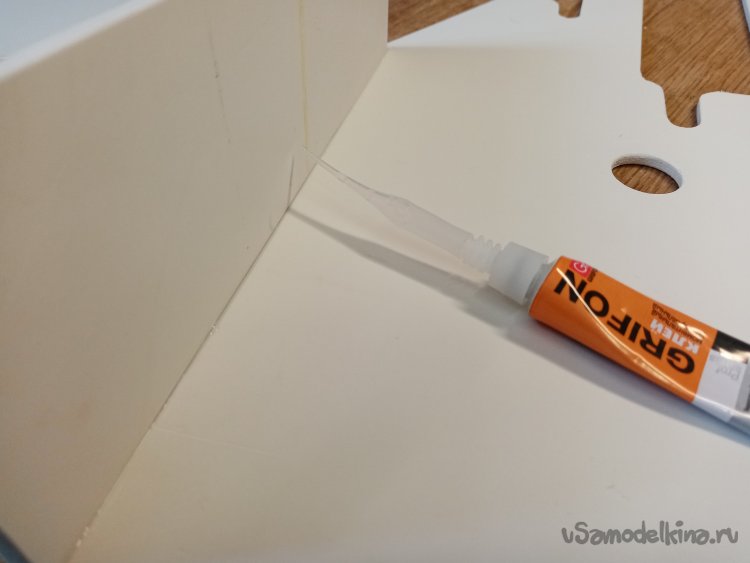 Прикладываю на почти готовую коробочку верхнюю деталь. Тщательно размечаю её положение и фиксирую нескотскими каплями клея. После застывания проливаю стыки деталей с внешней и внутренней стороны.