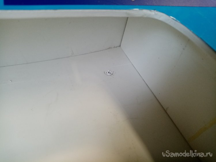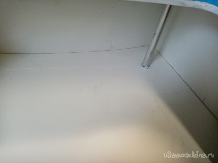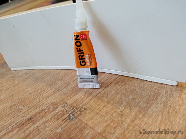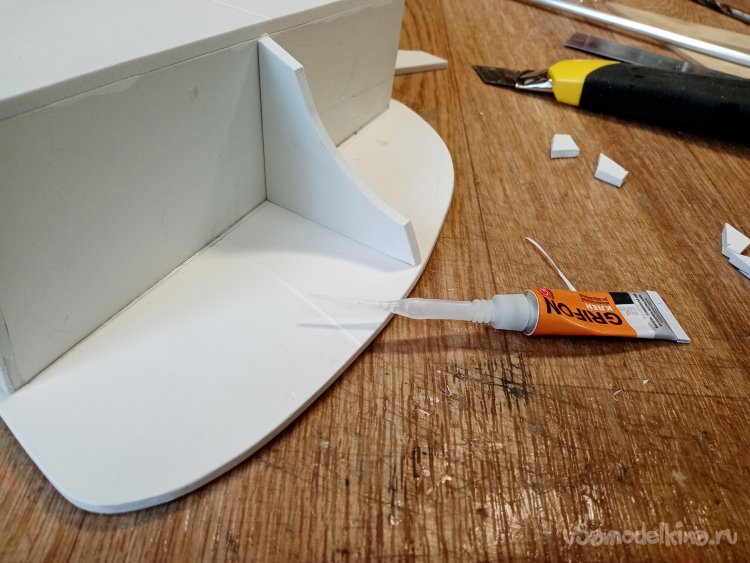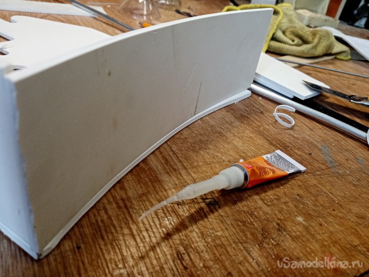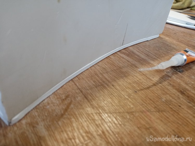 Следующая деталь задняя изогнутая стенка. Сначала приклеиваю её точками. Слегка поправляя в процессе положение. Затем проливаю стыки циакрином с внешней и внутренней стороны.