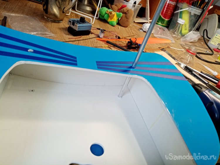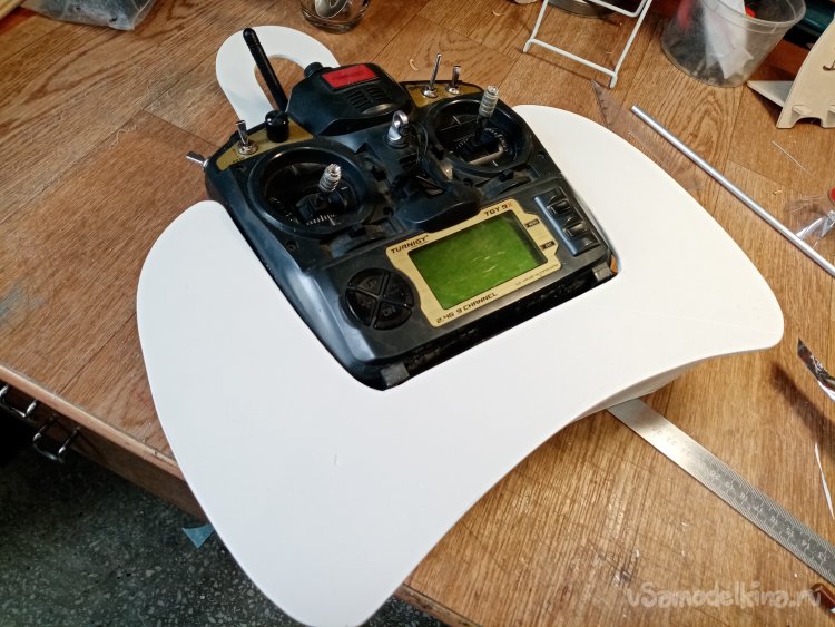 Устанавливаю передатчик в корпус столика. Нужно промерить и вычертить фиксирующие планки из пластика. Они будут удерживать пульт при перемещениях. По размерам вырезаю детали. Немного по краю шкуркой. Предварительно примеряв по месту. Приклеиваю эти вертикальные полоски. При установке передатчика в столик, они распирают металлическую ручку, фиксируя его. Заодно служат усилениями ручки для переноски этого сооружения на поле (боя). Несколько фото для полного понимания и общего вида приспособления.