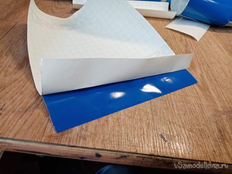 Заднюю стенку украшаю темного голубой пленкой. процесс протекает следующим образом. Протираю поверхность влажной тряпочкой. Отрезаю нужный кусок пленки с легким запасом по всем сторонам. Затем снимаю защиту с одного края пленки.