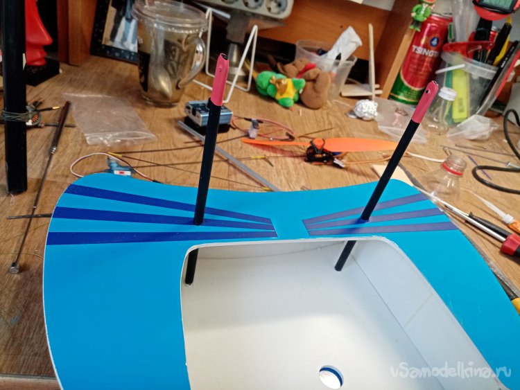 Поэтому устанавливаю трубочки в верхние отверстия, корректирую их положение. Добиваясь вертикальности и параллельности. Слегка вжимаю их в пластик нижней пластины. Остаются отметки. Затем прокалываю шилом в этом месте отверстия. И ориентируясь по ним сверлю отверстия с обратной стороны.