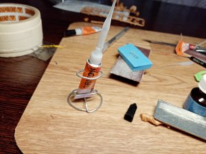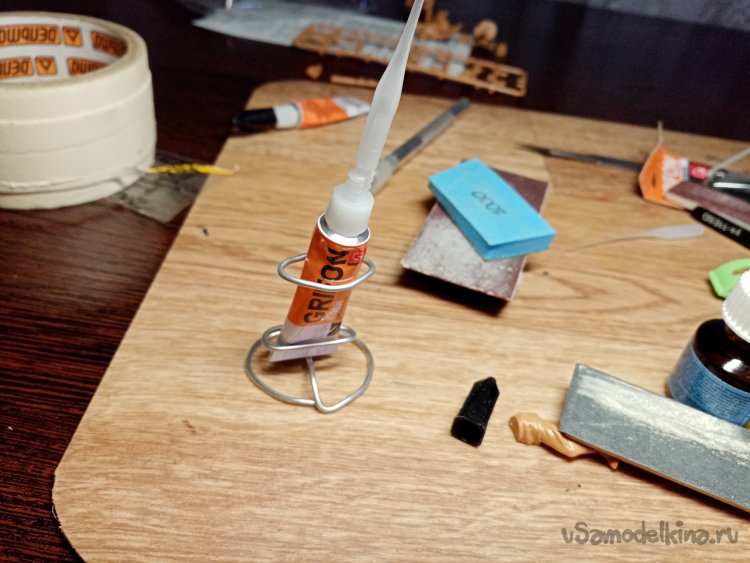 Для удобства работы с клеем, одеваю на кончик тюбика специальную трубку. Купленную на АлиЭкспрессе. В ней клей на застывает. Для гарантии этого тюбик желательно держать в вертикальном положении в перерывах. Клей из трубки стекает и не застывает. Из алюминиевой проволоки изготовил небольшой держатель для тюбика. С достаточно большим основанием, для большей устойчивости.