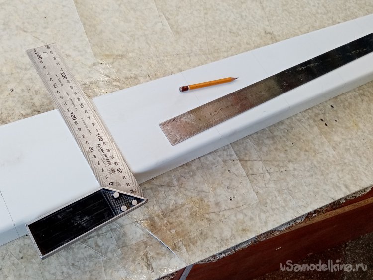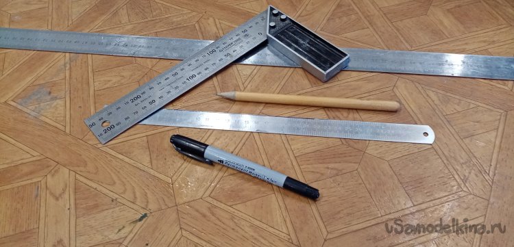 Приготовил инструмент, разметочный. Угольник. Металлический, линейки метровые, пятидесятисантиметровые. Фломастер. И разметочный карандаш с твердосплавным стержнем.