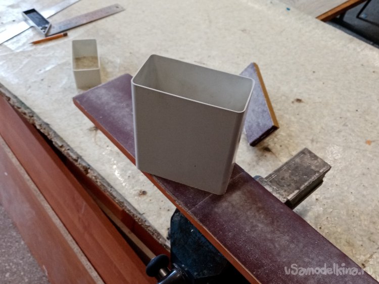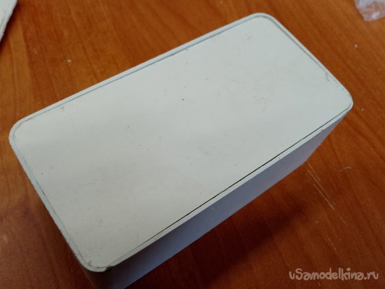 Дно достаточно плотно входит в коробочку. Поэтому вставляю его в внешней стороны и прижимаю к основанию ручкой от напильника. Просто она попалась под руку. После позиционирования днища вровень со стенками проливаю все стыки циакрином. В этом случай очень хорошо пригодилась длинная трубочка.