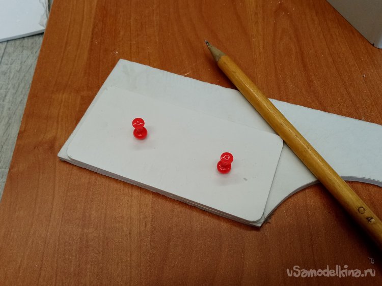 Нужно вычертить контуры для других деталей. Прижимаю контрольный шаблон при помощи обыкновенных канцелярских кнопок к заготовке. Каким приемом предотвращаю детали от сдвига при разметке.
