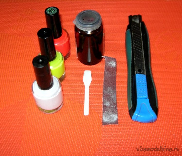 Перейдем к изготовлению. Из инструментов только нож, еще нужны наждачка Р 180, разведенный спиртом клей БФ-2/6 (в баночке из под лекарства), флюоресцирующие лаки и черный спиртовой маркер.