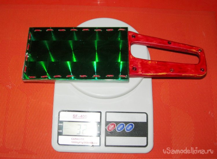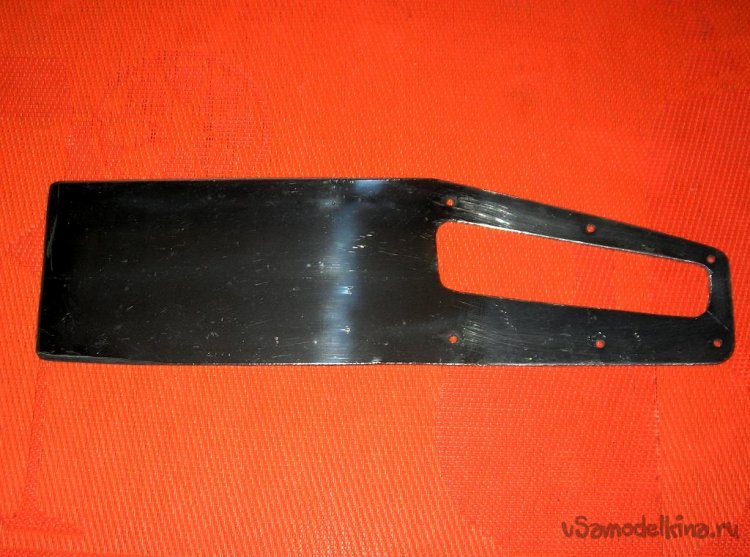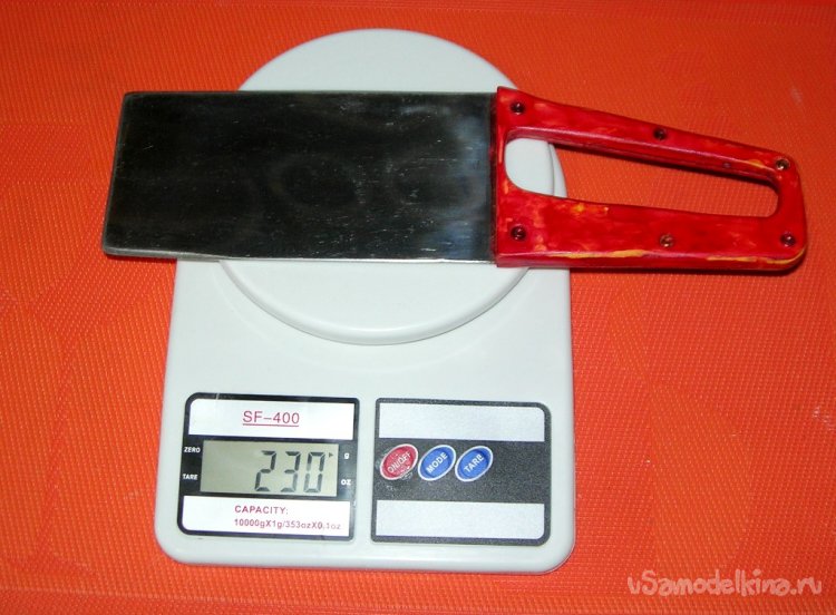 Окончательный размер определил добытый мною кусок материала. Для защиты руки и надежности хвата, место для рукоятки сделал в виде прорези, оставив материал сверху. Сделал отверстия для крепления рукоятки. Заточил спереди и с торца.