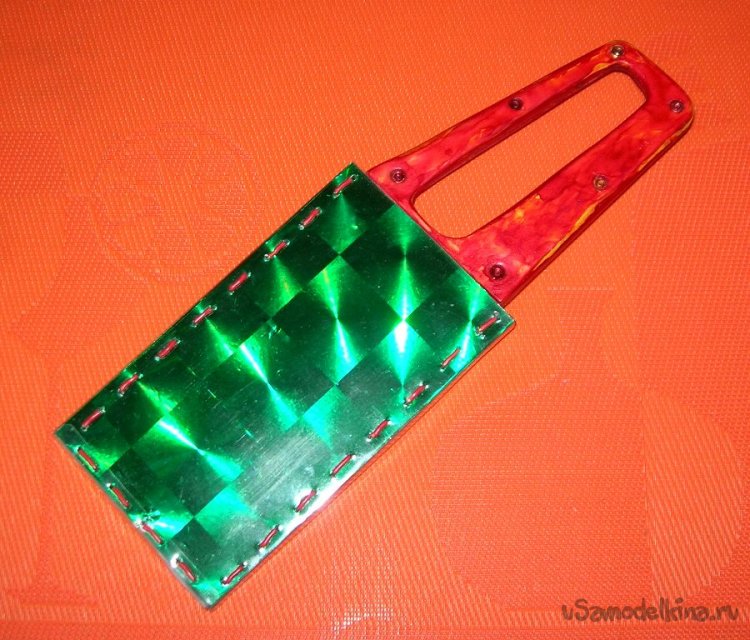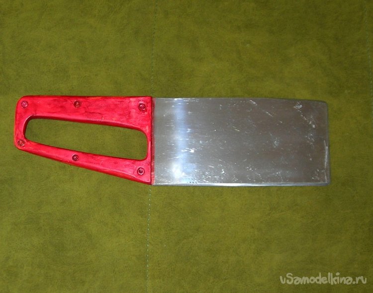 Саму рукоятку собрал из трех слоев (2+1) вспененного ПВХ, обработал наждачкой, закрепил болтиками. Из ПВХ же сделал ножны, приложил сверху на заготовки ножен прозрачный пластик с наклеенной пленкой, приделал с одной стороны петлю для ленты (резинки). После чего собрал все на скобках из медной проволоки.