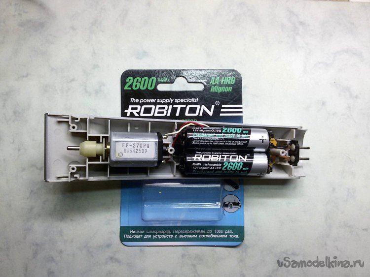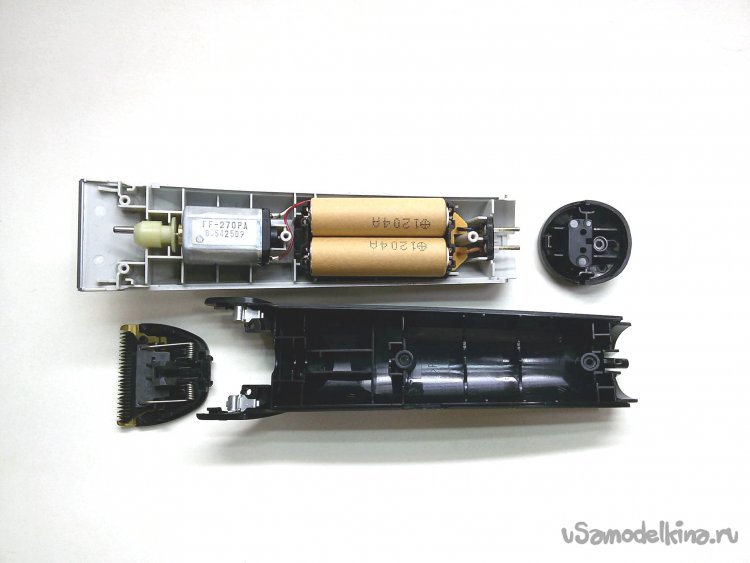 Разобрал корпус машинки для стрижки. Там находятся два последовательно соединенных Ni-Mh аккумулятора неизвестной емкости, напряжением по 1,2В, с выступающими контактными штырьками для фиксации на контактах. Аккумуляторы питают микродвигатель постоянного тока мод. FF-270PA (1,5…6,0В; 0,4…0,7А). Однако при напряжении питания 2,5В, микродвигатель уже не справляется с нагрузкой и аккумуляторы нужно заряжать.