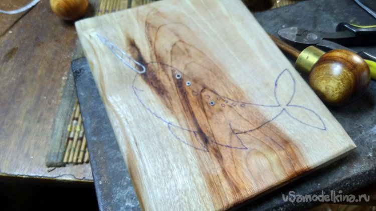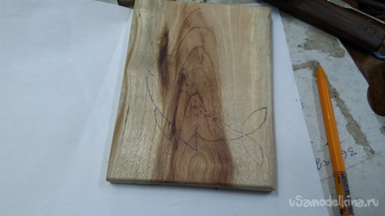 Сначала рисуется эскиз в натуральную величину, потом через копирку переносится на дощечку, можно и напрямую рисовать, но я выбираю масштаб рисунка, по размеру дощечки и расположению рисунка на ней. Сначала карандашом простым, потом шариковой авторучкой, так линии получаются контрастными и не стираются как карандашные, заготовку придётся вертеть в процессе инкрустации и линии могут затереться.
