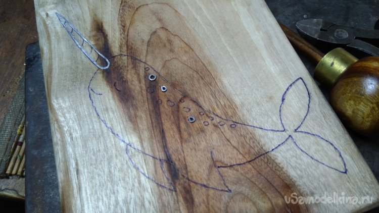 Ножи полукруглые и прямые, начиная от миллиметровой ширины, и до трёх миллиметров ширины. Непременное условие для получения ровной линии, после первого прокола не переставлять нож на всю ширину, а переставлять только на треть, тогда первый прокол служит направляющим, и так последовательно прокалывая и на одну треть переставляя нож ведётся линия. Не рекомендуется сразу прокалывать весь рисунок, тем более линии расположенные рядом, может сколоться дерево. Сначала прокалывается тонким ножом, проволока выгибается по форме линии и слегка наживляется молотком, если где-то проволока упирается, то можно более толстым ножом линии пройтись. Вся проволока сразу не вбивается, если где-то будет ошибка, то проволоку может и не удастся извлечь для замены. Если всё сходится, то проволока вбивается до того как ровно, или чуть с выпуском. Лучше потом сошлифовать металл, чем всю плоскость деревяшки. Молотком тоже если промахнуться, то может остаться вмятина. Можно конечно её исправить намочив водой и прогладив горячим утюгом, волокна древесины при этом распрямляются, но лучше не допускать вмятин.
