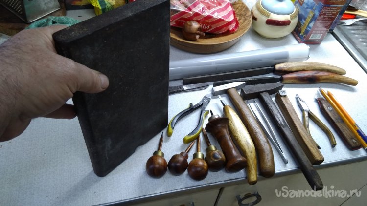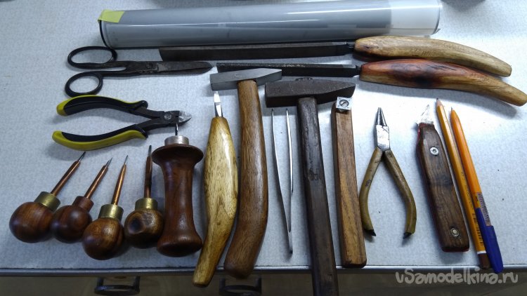 Собрал инструменты после работы, не так уж и мало получается, хотя можно обойтись и меньшим, но я люблю работать с комфортом, не стремясь преодолевать трудности которые сам себе и создаю )) Если у меня не хватает какого-то инструмента, я его делаю. Лучше потратить немного времени, но сэкономить его потом. Например, молоток, я его сделал специально для инкрустации, рукоятку сделал из виноградной лозы, такая изогнутая форма не даёт уставать руке при длительной работе. Или вот ножи, вроде разница небольшая, шириной один миллиметр, и тут-же рядом второй с шириной два миллиметра. А при работе разница между ними колоссальная! Ну и полукруглые ножи тоже различаются, да и толщина лезвия тоже влияет на удобство работы. Бокорезы, если использовать обычные, то они на перекусываемом материале оставляют «утюжок», а мне надо чтобы торец был прямой, а если надо чтобы он прилегал к другой полоске под каким-то углом, то я сточу напильником столько, сколько надо.