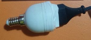 Так как была задача сделать быстро, не стал заморачиваться с разборкой переходника-вилки, а намотал провода поверх медных штырей. Поскольку провод многожильный, распустил немного и самого себя через него пропустил для лучшего контакта. Натянул на медь плотно и тоже заизолировал термоусадкой. Получилось так себе, и для увеличения надёжности зафиксировал термоусадку пластиковыми стяжками. Вроде вышло надёжно. Дальше повезло: переходник погрузился в остатки лампочки почти миллиметр в миллиметр и где-то там упёрся. На этом месте его и приматываем изолентой. Сегодня взял белую, в цвет изделия. Всё удалось, осталось проверить в деле.