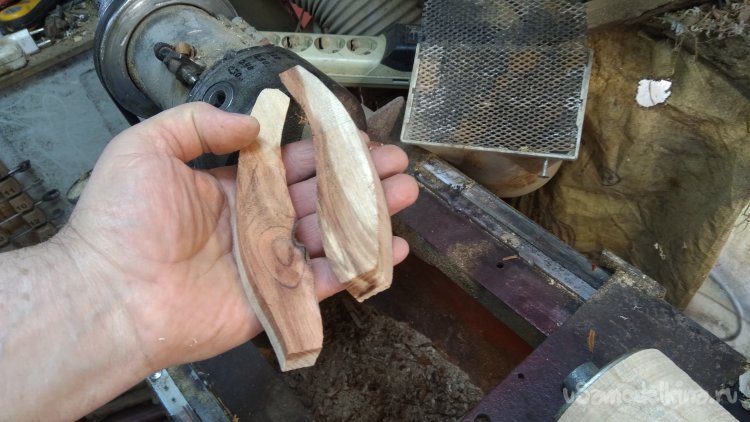 Нарисовал парочку рукояток на дощечке, потом выпилил на ленточной пиле.