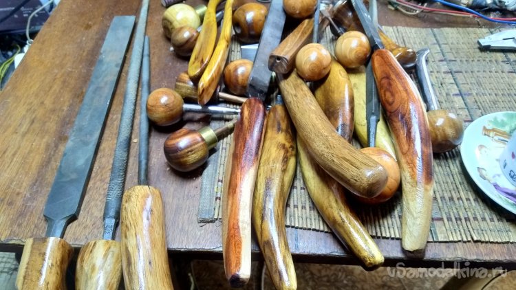 У меня тоже полно инструментов механизированных. Мультитулы, они-же реноваторы. Дремели, они-же бормашины. Фрезеры ручные, болгарки, они-же УШМ (Угло-Шлифовальные-Машины). Плоскошлифовальные машинки и орбитальные шлифовалки, и в сверлильном станке насадки для плоского шлифования. И даже в токарном станке летающий резец. Короче, возможности разнообразные для обработки дерева и металла. Но для инкрустации надо помягче и поточнее инструменты, обычные напильники. Но у обычных напильников рукоятки сделаны для работы стоя, и чтобы рука в локте была согнута под 90 градусов, меня это не устраивает, поэтому я и сделал рукоятки изогнутые, так чтобы при работе сидя было удобно.