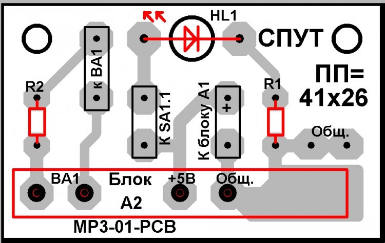 Печатная плата СПУТ выполнена из односторонне фольгированного стеклотекстолита размерами 41 х 26 х 1,5 мм (см. рисунки 2 и 3). Блок А2 устанавливается перпендикулярно плоскости ПП.