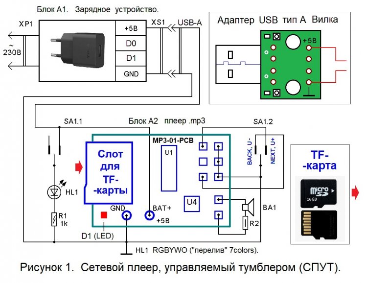 1). Включают ЗУ-БП в розетку ~230 Вольт. Если карта вставлена в слот модуля А2, то сразу же начинается воспроизведение трека. Если звука нет, а красный D1 мигает, то причиной может быть ранее установленная на «0» громкость воспроизведения. Уровень громкости запоминается при выключении СПУТ.
