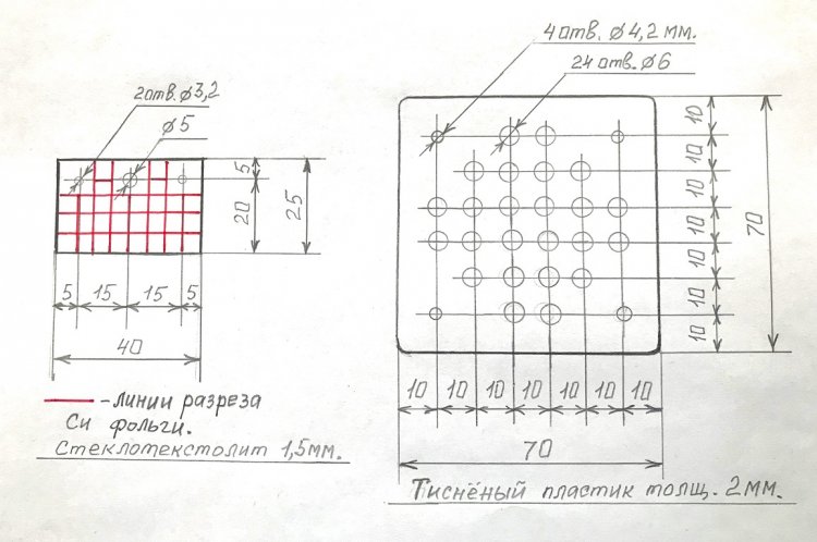 Слева – эскиз макетной платы, которая использована в авторском СПУТ вместо ПП (см. рисунок 2). Медная фольга с одной стороны макетной платы, изготовленной из односторонне фольгированного стеклотекстолита, разрезается резаком на квадратики размером 5х5 мм.
