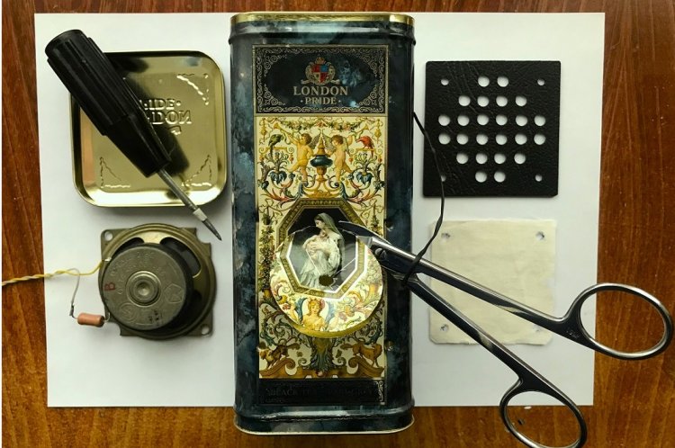 Вид на ПП, модуль А2 и динамик (он за модулем А2 прикручен винтами М4х16), закреплённые внутри жестяного корпуса – упаковочной коробки от байхового чёрного чая.