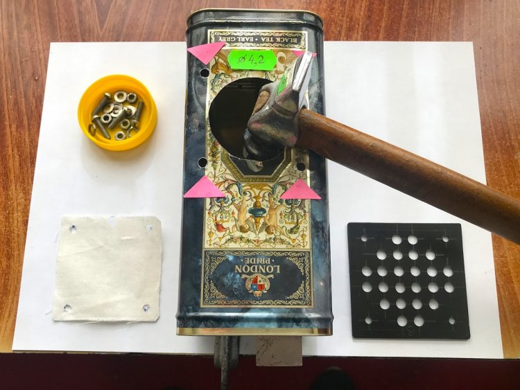 С внутренней стороны листовой жести после сверления образуются мелкие и опасные для пальцев рук заусеницы. Эти заусеницы ни зенковкой, ни расточкой надфилем снять сколько-нибудь удовлетворительно не удаётся. Поэтому все отверстия следует обстучать молотком на металлическом пуансоне (болванке), вставленном в корпус СПУТ. Болванку лучше зажимать струбциной на рабочем столе, но автору удалось проделать «обстукивание» заусениц удерживая пуансон внутри корпуса СПУТ рукой.