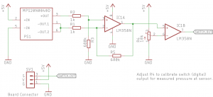 В оригинале упомянутой статьи датчик использован именно в качестве реле, и приведенная схема вполне заслуживает внимания. У меня же ее предназначение несколько другое: схема должна достаточно линейно измерять давление (читай – уровень воды) и выдавать сигнал в диапазоне 0-5 В, который далее поступает на АЦП процессора, в моем случае – PIC16F877. При таком использовании мы можем оперативно менять уровень воды в баке.