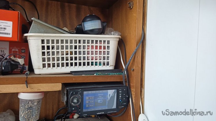 Для реализации этой идеи достаём из антресоли старую автомагнитолу и объёмный датчик. Но у этой Варты оказались нестандартные разъёмы для подключения. Поскольку переходники давно потерялись, следуем моему принципу «используй то, что под рукою, и не ищи себе другое». Из старого блока питания от персонального компьютера отрезаем разъём питания и с помощью ножовки по металлу делаем однопиновые разъёмчики для питания и колонок. Собираем стенд на столе, включаем, и тут понимаем, что у магнитолы есть сигнальный контакт, на который надо подавать +12 В с замка зажигания. Можно, конечно, и туда, и сюда подавать + 12 В одним блоком питания, но сбросятся настройки магнитолы. Поэтому пойдём на хитрость: один БП с малым током запускаем на магнитолу через просто розетку (это не даст сброситься настройкам), а БП с током 2 А через розетку-тройник через объёмный датчик. Думаю, логика понятна. И как бонус, я совсем забыл, что эта магнитола с ДВД, то есть можно и киношку на балконе посмотреть, если будет желание. Само собой, юсб для флешки тоже имеется. Для крепления автомагнитолы надо сделать кронштейны, по которым она, как по рельсам, вдвигается в шкаф. Для того, чтобы соединения проводков надёжно держались, используем пластиковые стяжки и прикрепляем все провода в один шлейф.