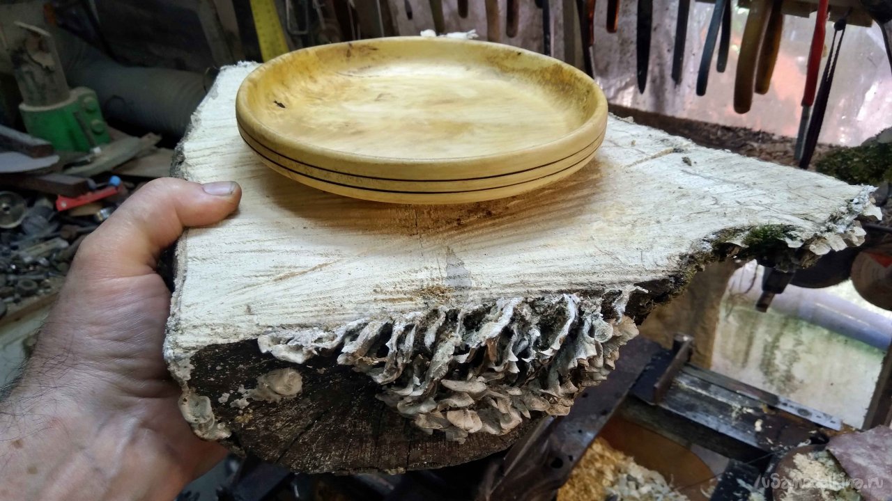 Валялась у меня рассоха грабовая, давно валялась, просто в качестве дров готовил. Но на ней выросли грибы после наводнения, я по огороду ходил собирал дрова и банки стеклянные с саморезами которые наладились в путь )) Воды было по колено и выше, ну ладно, саморезы вернул, дрова собрал, а тут чтобы уж не выкидывать, решил выточить тарелочку, иногда на таких рассохах удивительно красивый рисунок бывает, да если ещё и шпальт, то вообще прелесть. Шпальт это когда грибница проросла в дерево, но ещё не сделала дерево трухлявым.