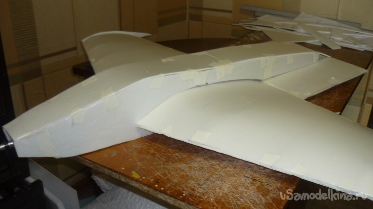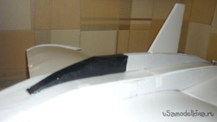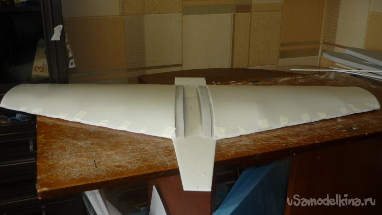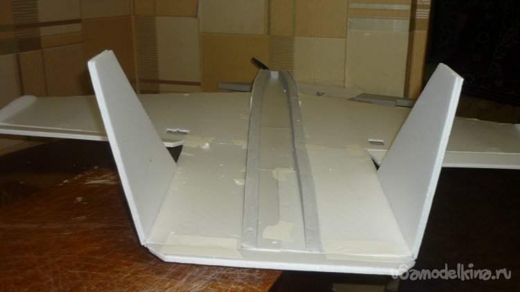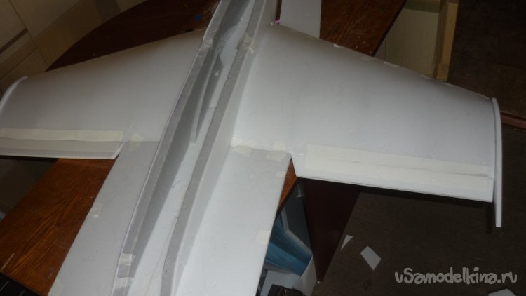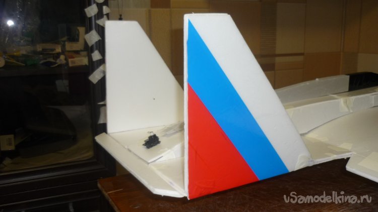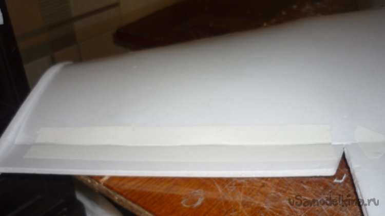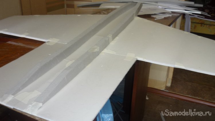Из потолочки вырезаю заготовки для руля высоты, склеиваю и навешиваю на бумажный, малярный скот