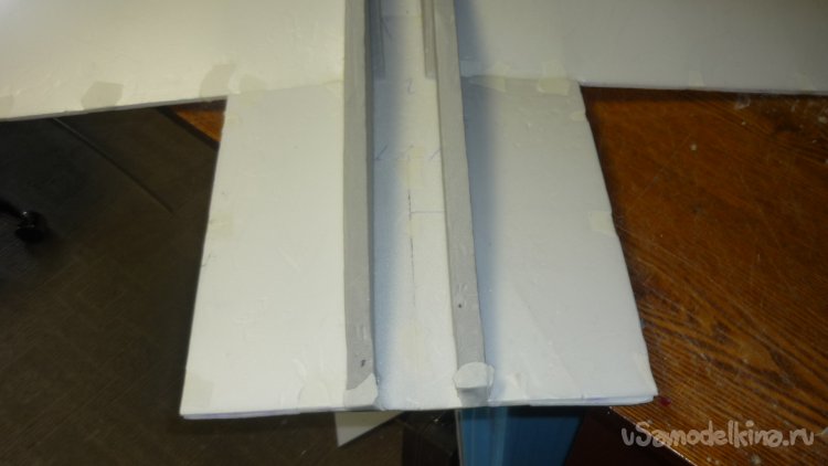 Монтирую заготовки боковых стенок фюзеляжа на верхней стороне модели по всей длине.