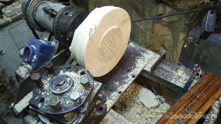 Первая тарелочка из граба у меня пока отлёживается, вчера решил остатки рассохи проточить, закрепил на планшайбе, разметил диаметр, который можно получить максимальный. Рассоха ведь кривая и переменной толщины, поэтому выбирал центр вращения чтобы получить максимальный размер готовой тарелки. Потом на ленточной пиле обрезал по контуру и топором стесал чтобы уменьшить дисбаланс при установке в токарный станок.