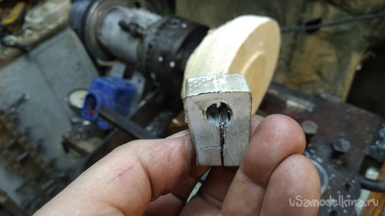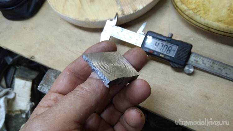 После того как отрезал заготовки, зажал в патрон и проточил, красоты не добивался, просто грани сделал ровными и параллельными, исходная болванка у меня не очень хорошо была зажата, прижим по скорому придумал из подручных материалов, поэтому линии реза не совпадали.