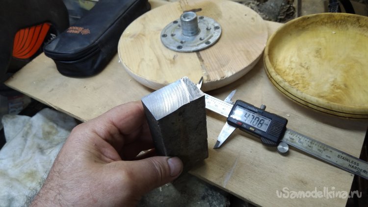 Оправка с пильным диском у меня есть, сделал под разные размеры фрез. Пробовал пилить дисковой пилой по дереву, но пила уже тупая, кромки твердосплавных напаек, с одной стороны, более изношены, поэтому пилу уводит от линии реза, пока приспособление для заточки у меня нет, взял пилу из Р18, самокал, но диаметр маловат, за один раз не удаётся отрезать болванку.
