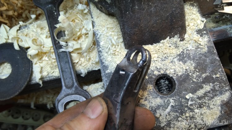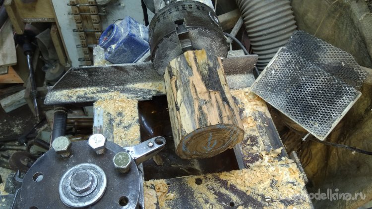 На корпус резца наварил электросваркой гвоздь, загнул по форме нужной. Это поддержка обоймы от прогиба вниз, толщина ведь обоймы незначительная, а усилие резания бывает очень большим, на свилях и сучках, при поперечном точении сучков удары довольно сильные. Можете сами попробовать срезать сучок поперёк простым ножом )) Их и стамеской с трудом можно срезать, а уж чтобы чисто получилось, так это просто удача. А тут строгает поперёк всего )) Да хоть торцевое, хоть продольное или поперечное. Примерно как фрезер, но и как рубанок.