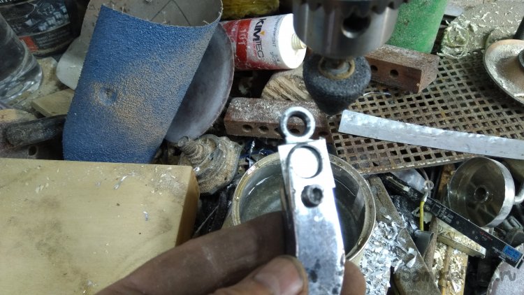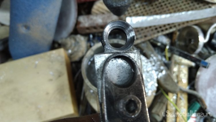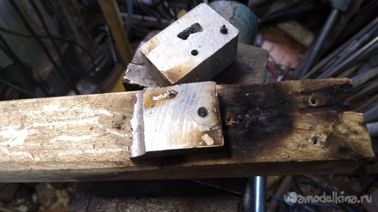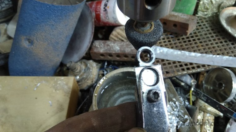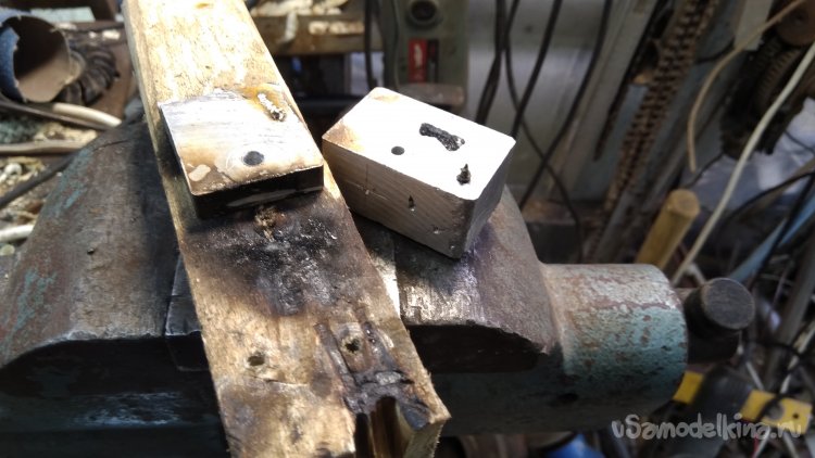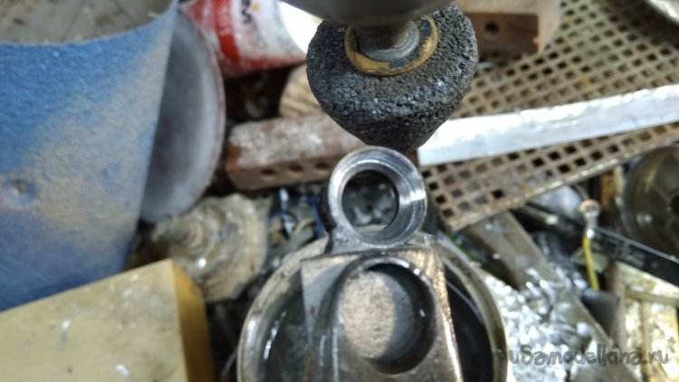 Обойму подшипника зажимаю между двумя алюминиевыми пластинами, навариваю электросваркой слой в пару миллиметров с внешней стороны обоймы в одном месте, потом к этому слою привариваю гвоздь, загнутый буквой U. Шлифую в размер прорези, сделанной в резце, и затачиваю внутреннюю часть обоймы шарошками.