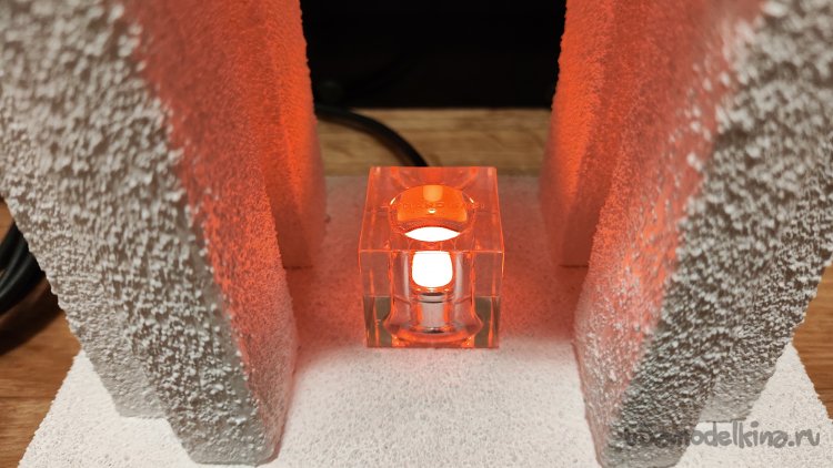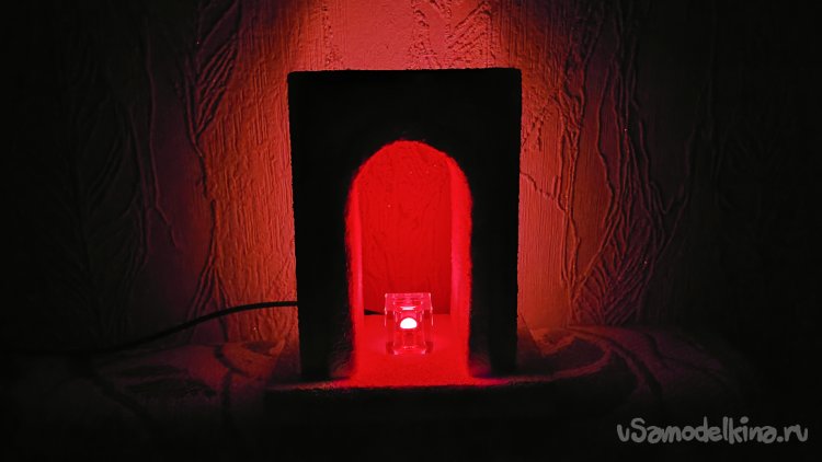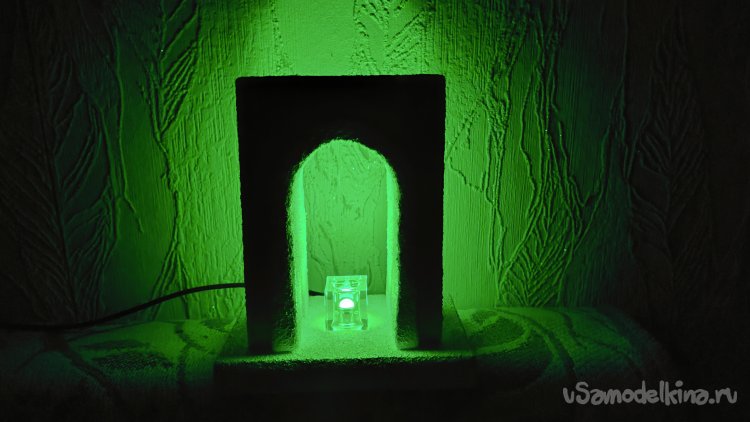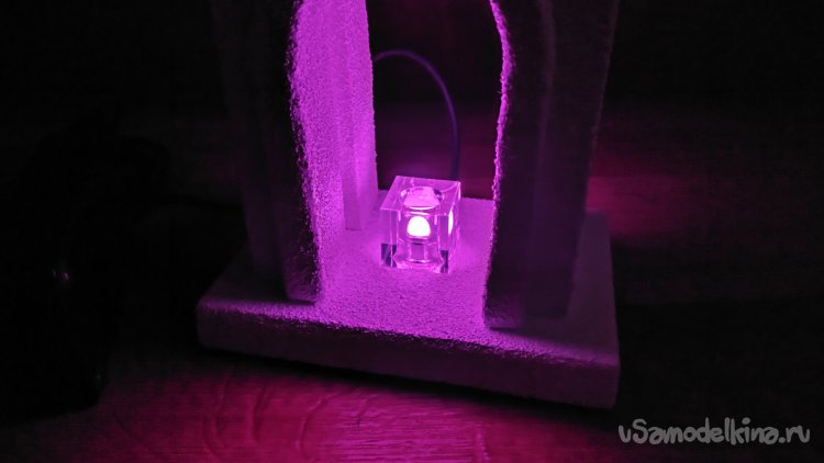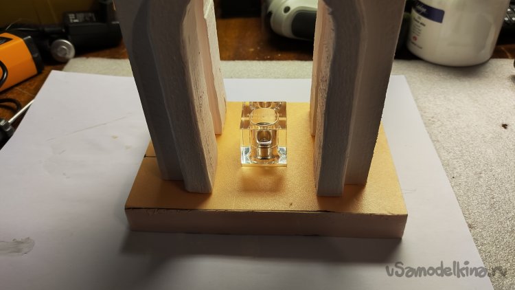 Проверяю, как светится ночник и решаю ограничиться одним источником света. Приклеиваю арку к основанию. Места стыка, кроме внутренней части, куда тяжело дотянуться, промазываю титановыми белилами, растушовывая их по поверхностям, чтобы не было видно место дополнительной покраски. На всю сборку было потрачено около недели. Большую часть времени заняла покраска.