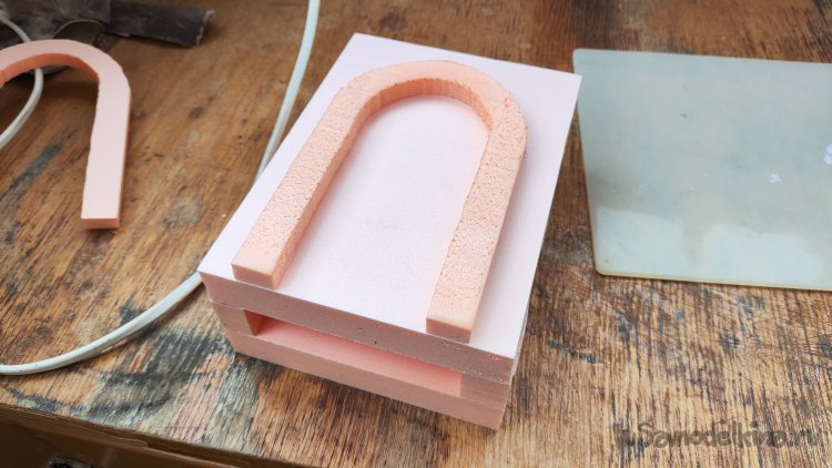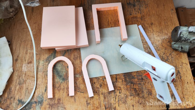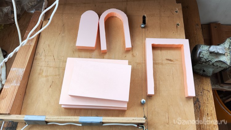 Начинаю склеивать все части между собой. Сначала центральные части, затем приклеиваю арки с одной и так же с другой стороны. Арки после горячего вырезания немного утянуло, приходится их удерживать при приклеивании. Именно из-за этого не стал вырезать центральную часть, пока не было все склеено.