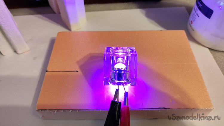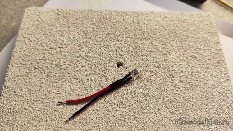 Центрирую и вклеиваю светодиод на термоклей. Центрирование необходимо, так как свет от светодиода не рассеянный и его будет видно на арке.