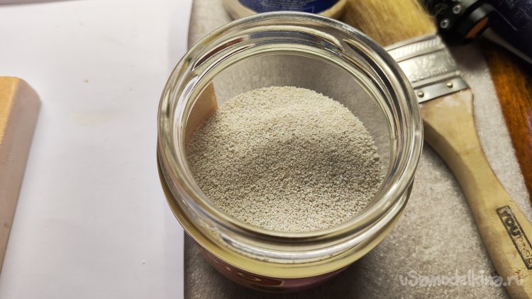 Покрываю основание всё той же перламутровой акриловой эмалью и по мокрому посыпаю песком. Жду, когда высохнет, лишнее сметаю кистью.