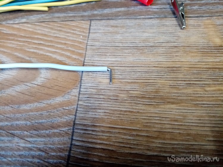 Вставляю провод в отверстие и загибаю прижимая провод к железке. Затем зажимаю основание провода при помощи тонкогубцев.