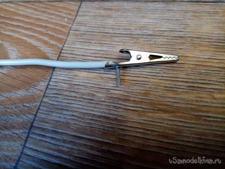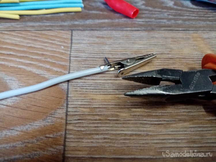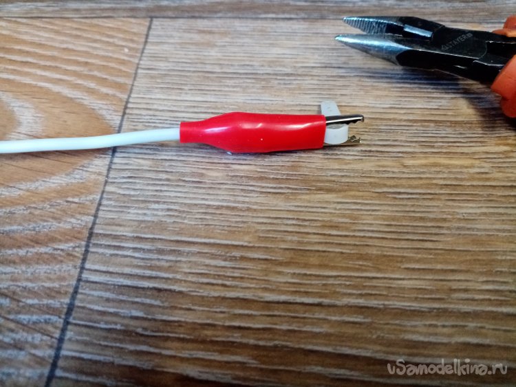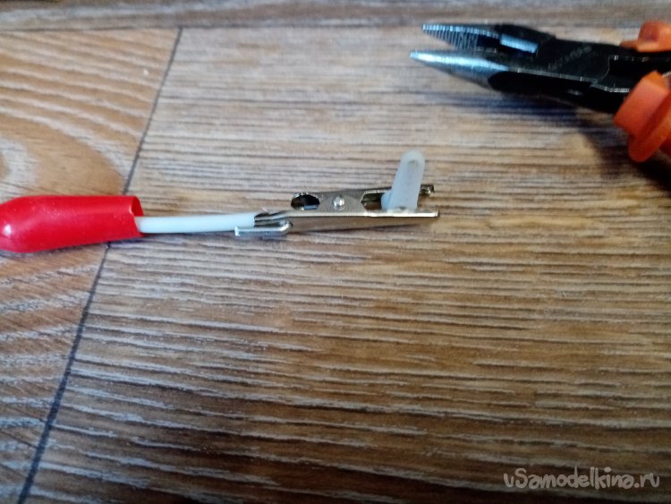 В результате имею хорошо закрепленный крокодильчик на кончике гибкого провода. Затем нужно установить защитный чехол.