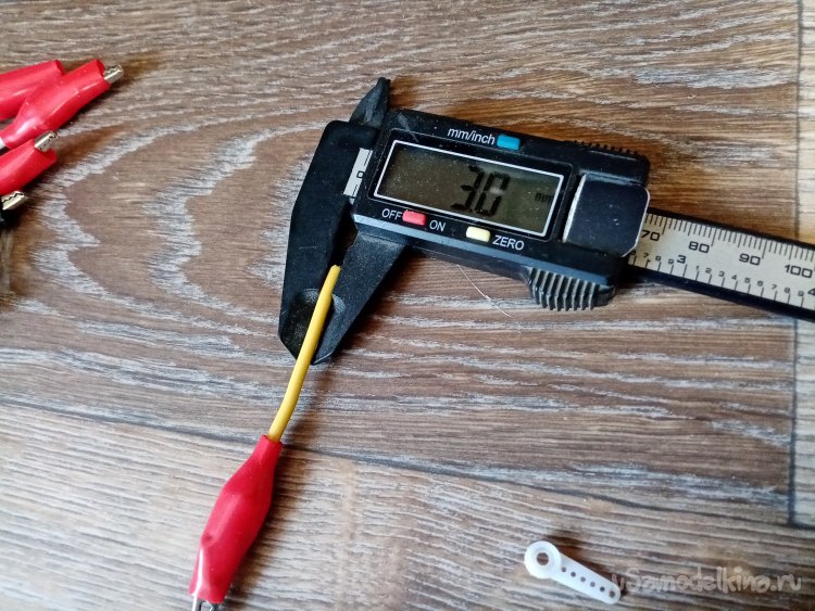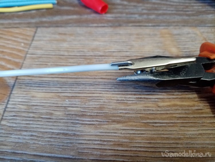 Есть тонкость. Поскольку железяки топорщатся и натянуть его проблематично, зажимаю в губках любую подходящую штуковину. В данном случае подвернулась качалка от сервопривода.