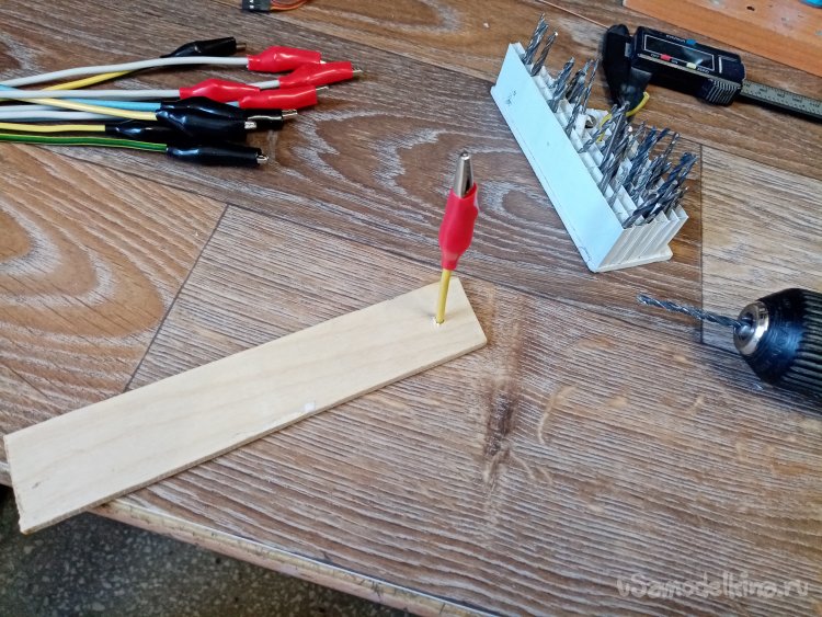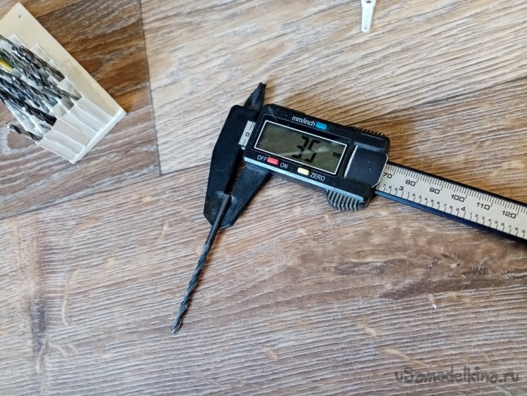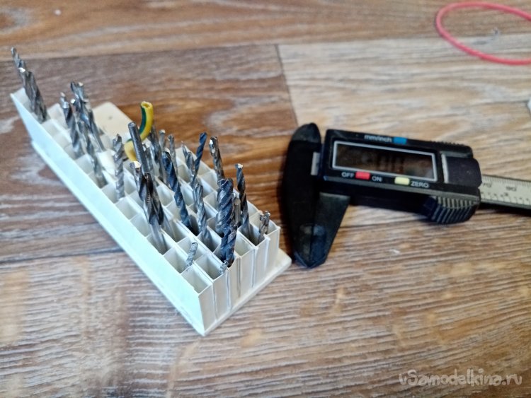 Выбираю подходящий диаметр сверла с нужными припусками. Есть в наличии такая колодочка для сверл. Изначально попытался изготовить подобную конструкцию из дерева под каждый размер сверла свое отверстие. Но попытка не удалась. Юные пилоты тыкали сверла во все дыры, не смотря на надписи под отверстиями.