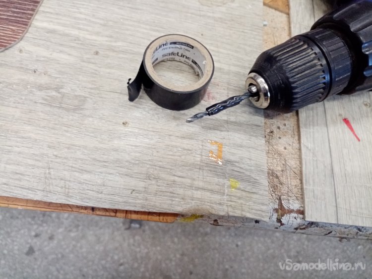 Понятное дело, что фиксатор сверла на нужную глубину пропал. Все как всегда, он конечно никуда не делся и находится в моделке и я его, разумеется, найду, когда нибудь, это точно. Но в данной ситуации прерываю поиски и воспользуюсь простой изолентой. Фиксирую глубину сверления в районе 12 мм. Поскольку толщина основания у меня 16мм. Но пока прошло только двадцать минут работы. Конечно включая поиски нужного.